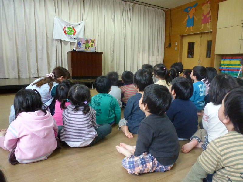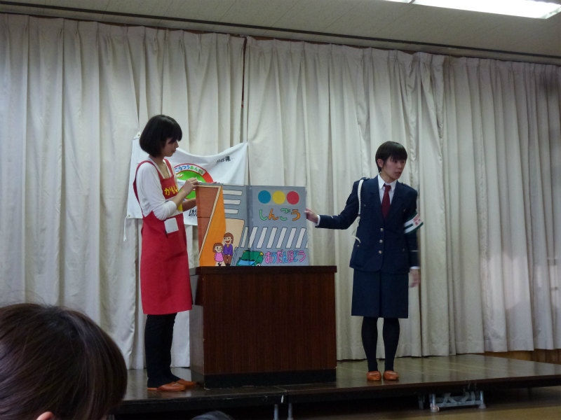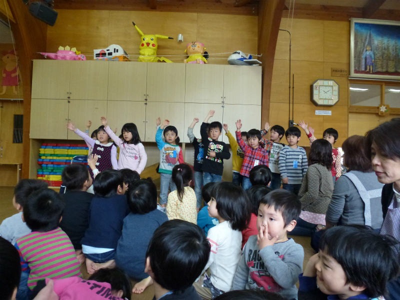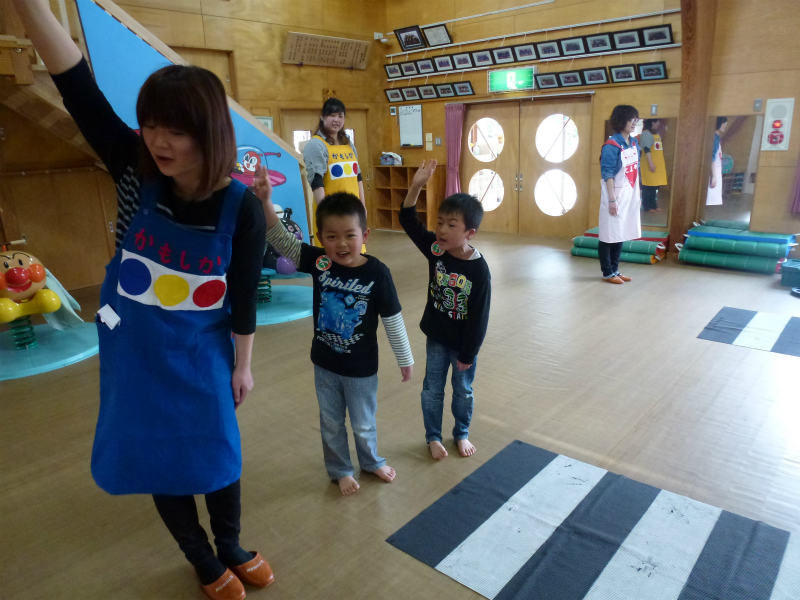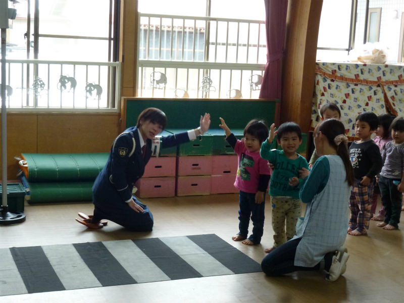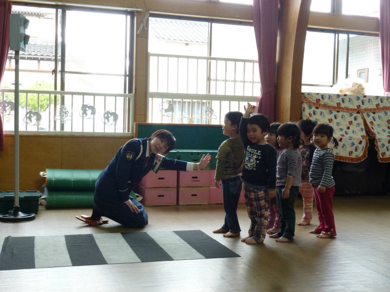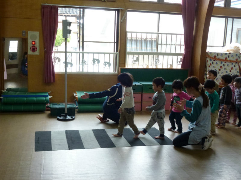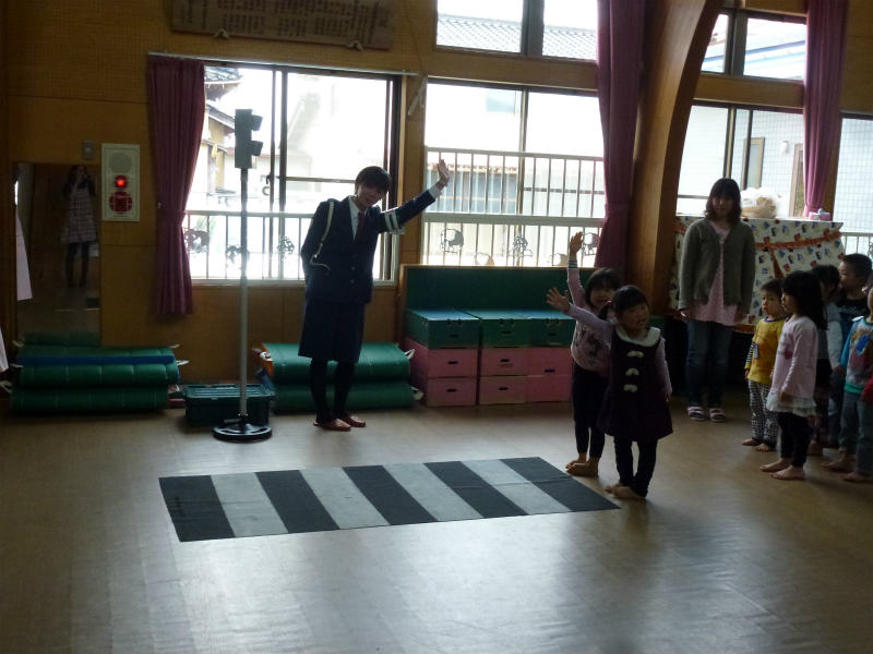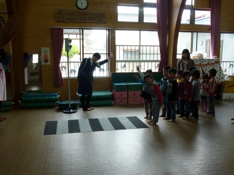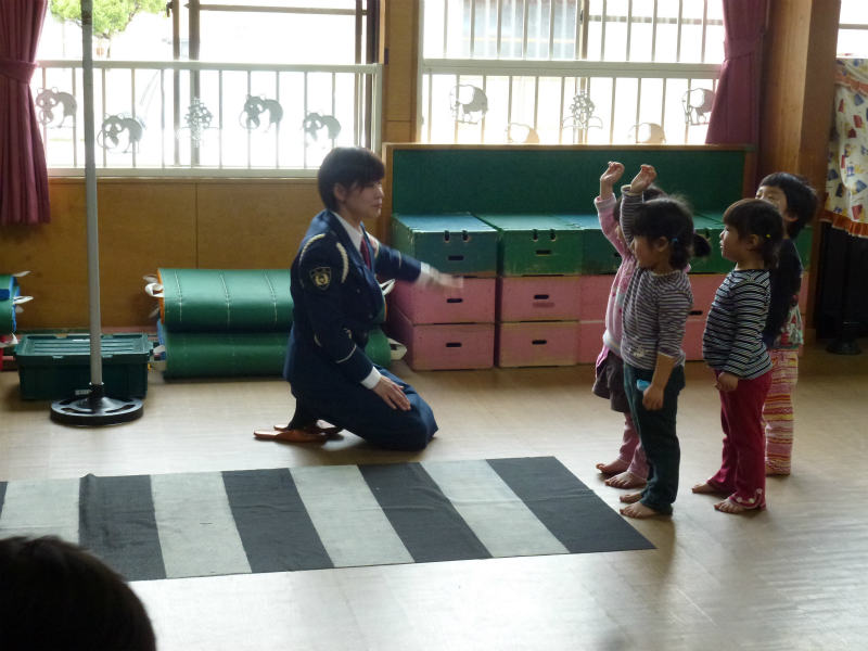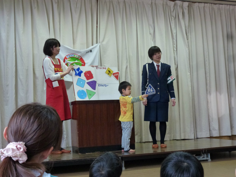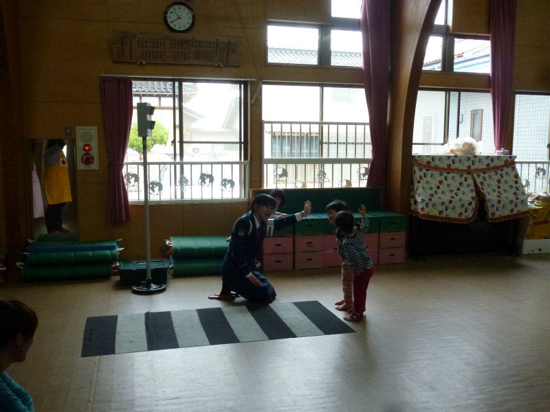 はじめに、年長さんが年中さん年少さんにストップの約束のお手本を見せます 「僕たち、上手でしょ」