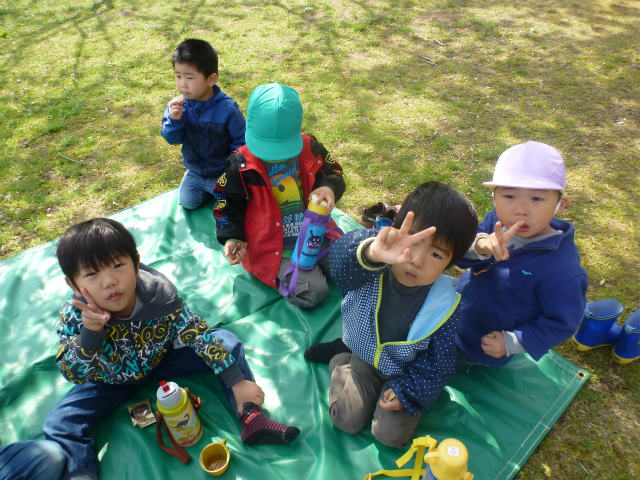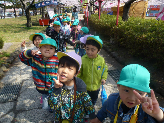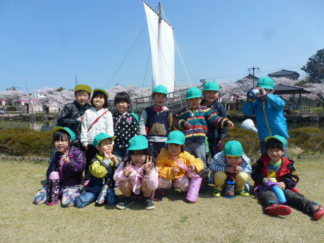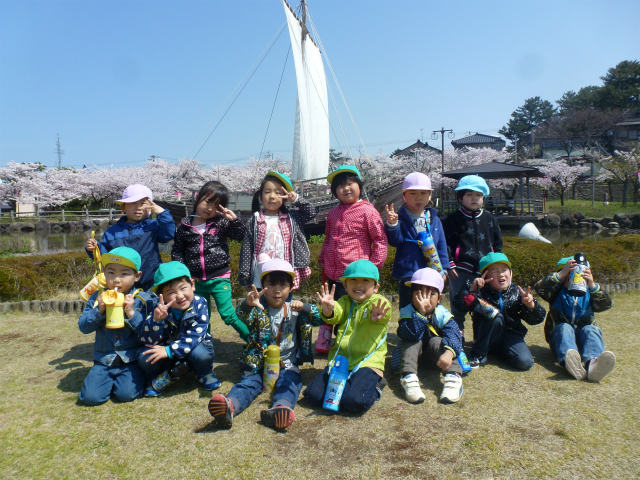 4月22日(火)、年長児・年中児が日和山公園にお花見に行って来ました朝から水筒を片手にウキウキ気分の子ども達みんなでわんわんバスに乗ってお出かけです