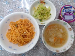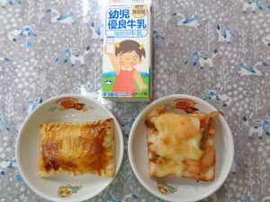 1日の給食は『ナポリタン・キャベツのさっぱりサラダ・肉団子スープ・ゼリー』で、おやつは『ピザトーストorアップルパイ・牛乳』でした
