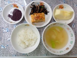 2日の給食は『五目卵焼き・ひじき煮・ゆかり・みそ汁・りんご』でした🍳