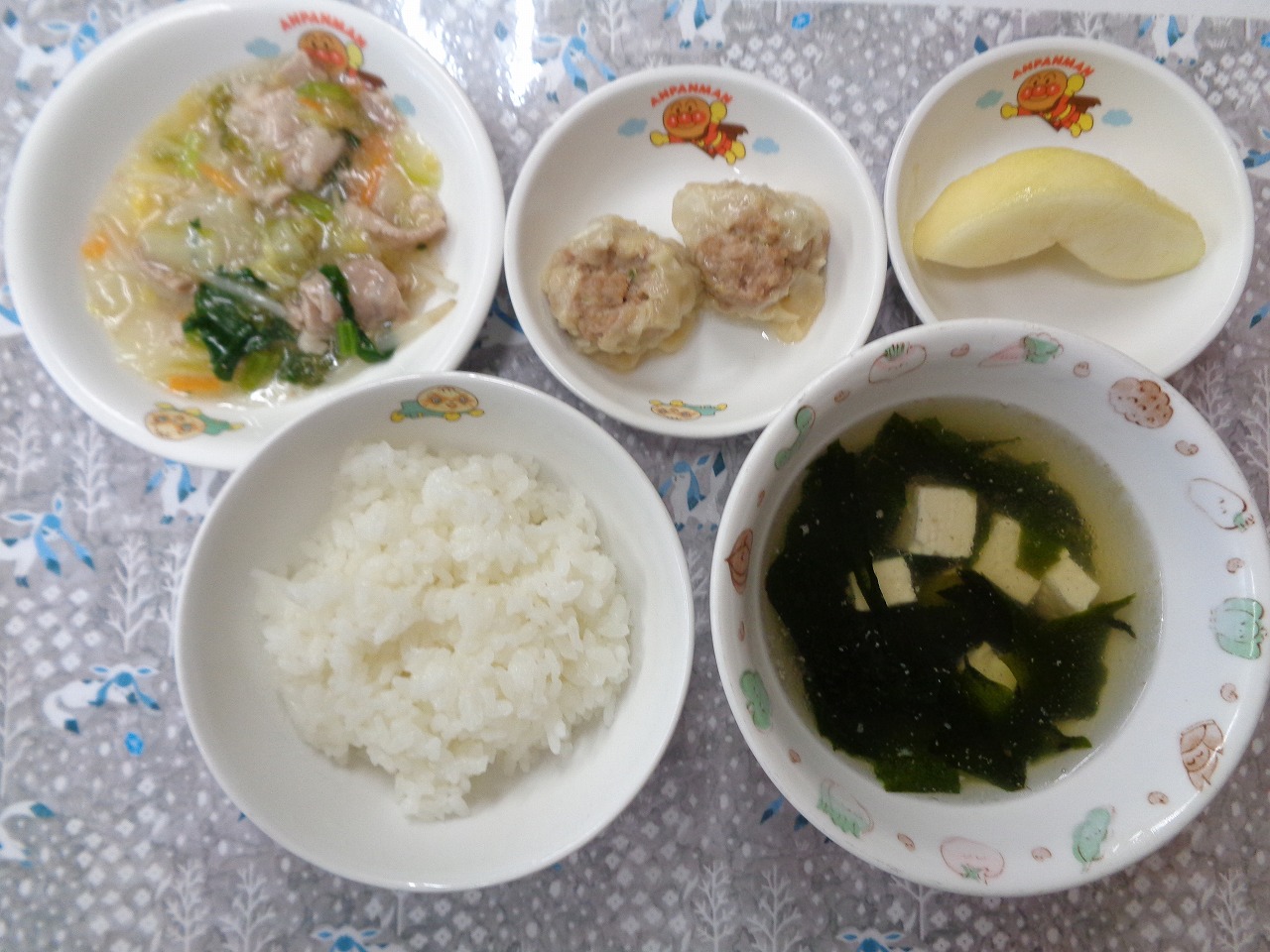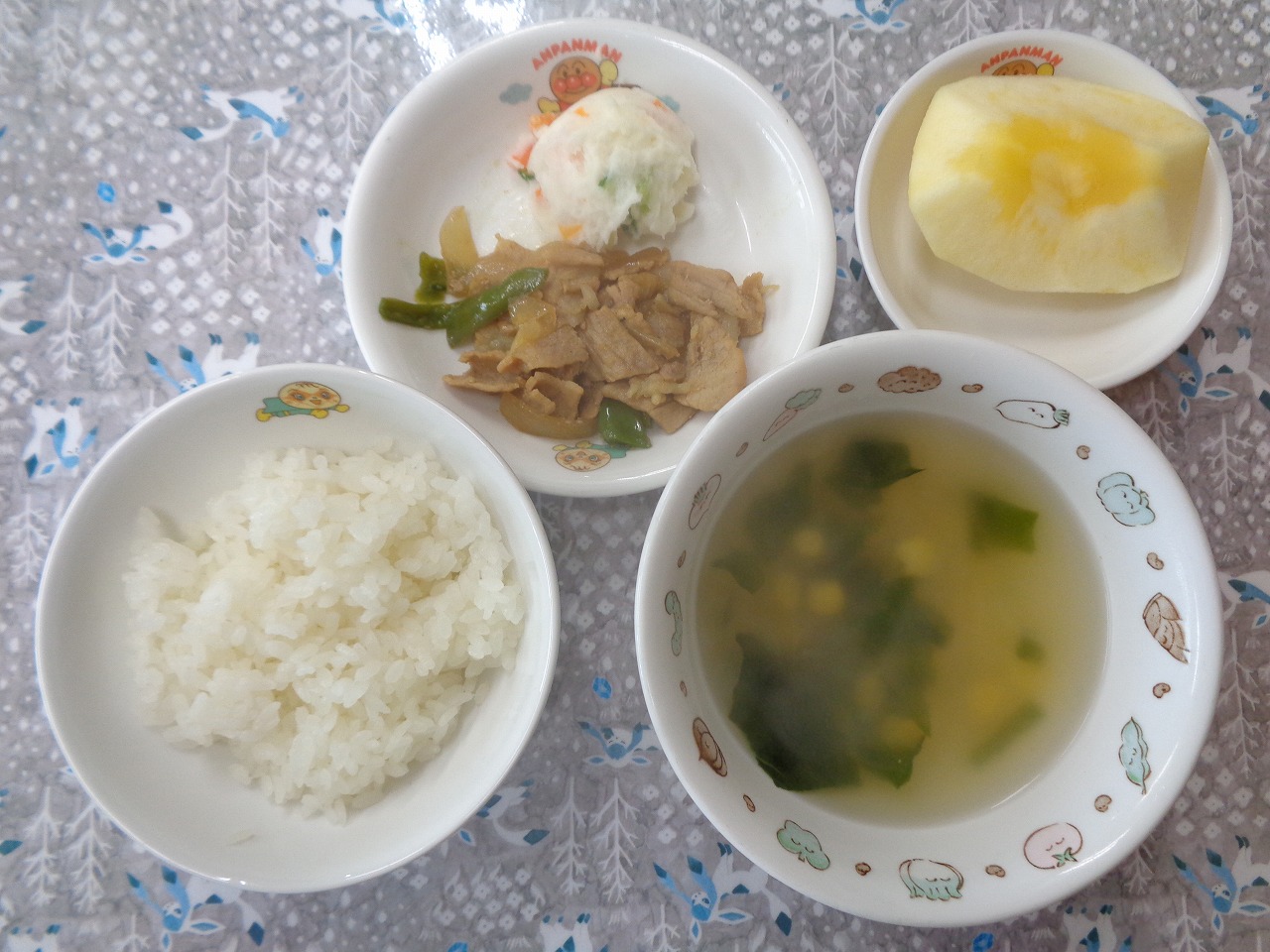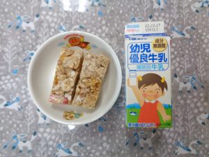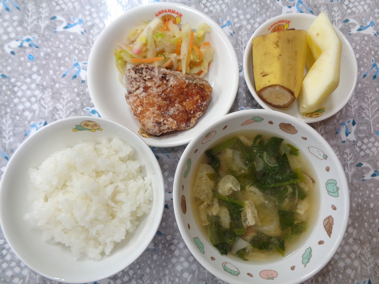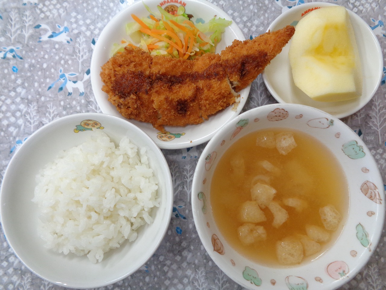 6日の給食は『ささみフライ・ミックスキャベツ・みそ汁・りんご』で、おやつは『ハリハリおにぎり・麦茶』でした