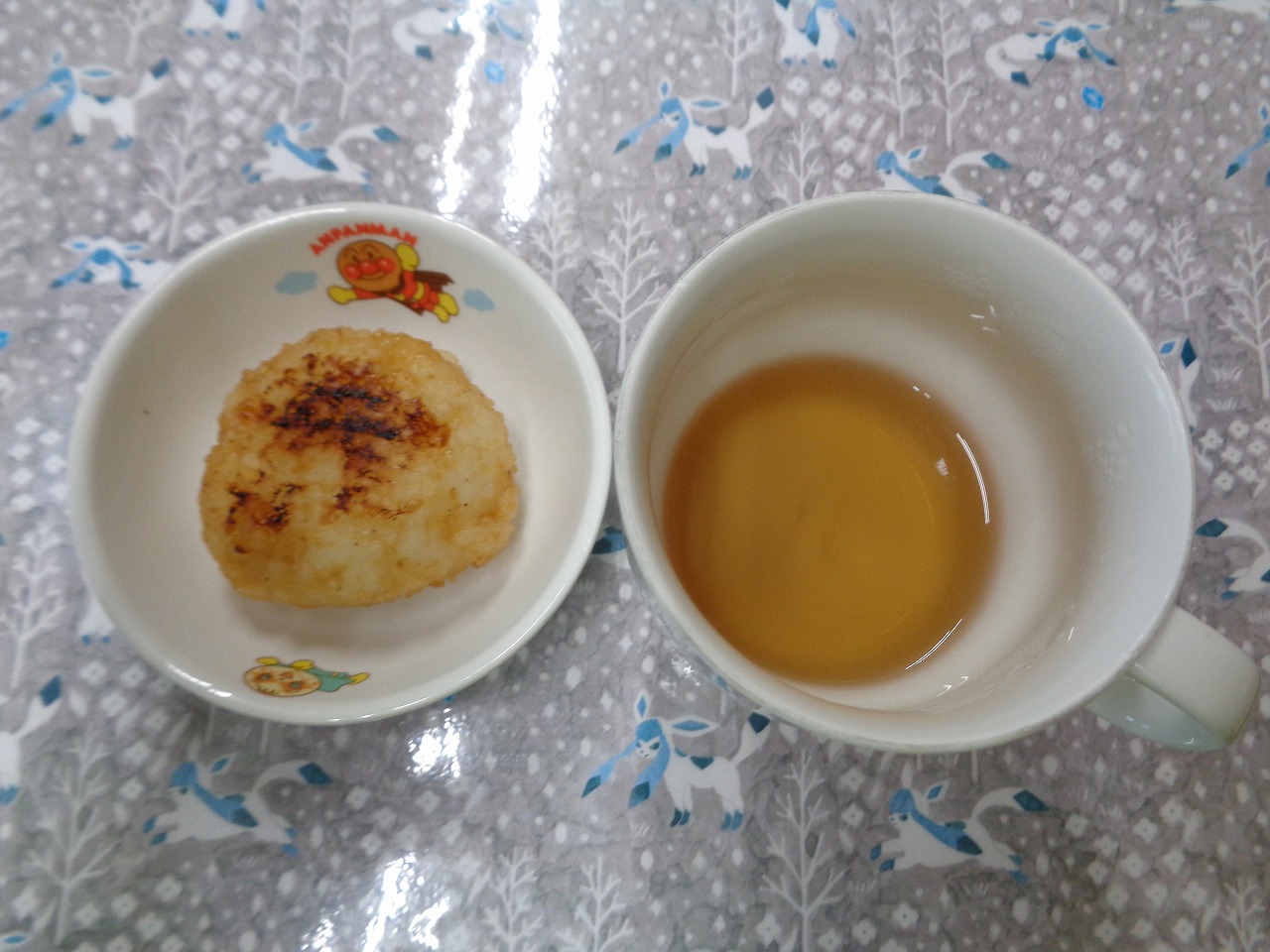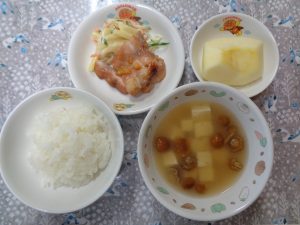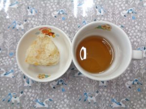 15日の給食は『鶏肉のマーマレード焼き・マカロニサラダ・なめこ汁・りんご』で、おやつは『焼きおにぎり・麦茶』でした。焼きおにぎり🍙は大人気で、おかわりをみんなで分け合って食べたそうです