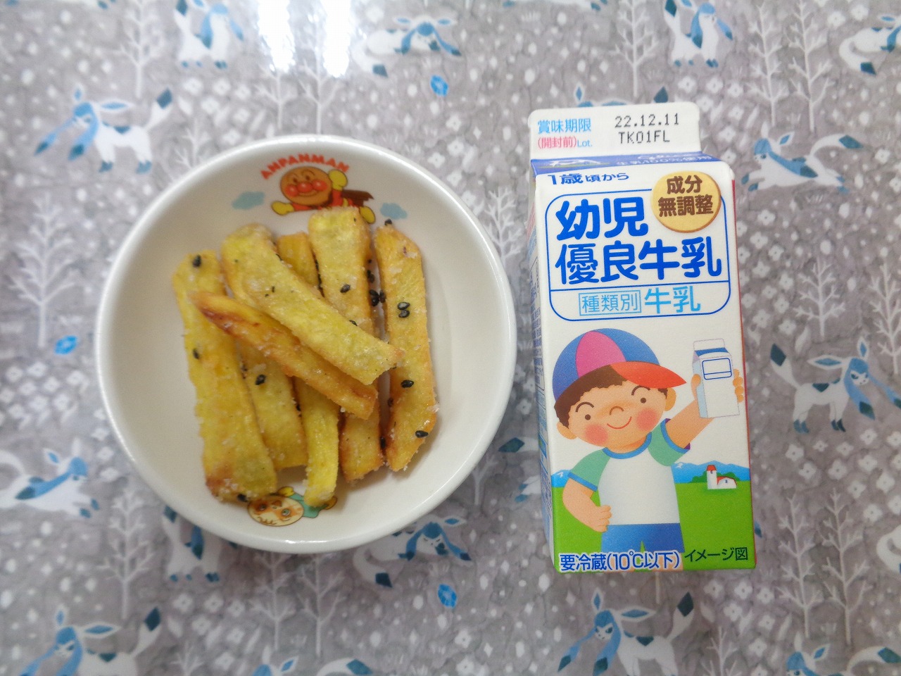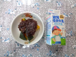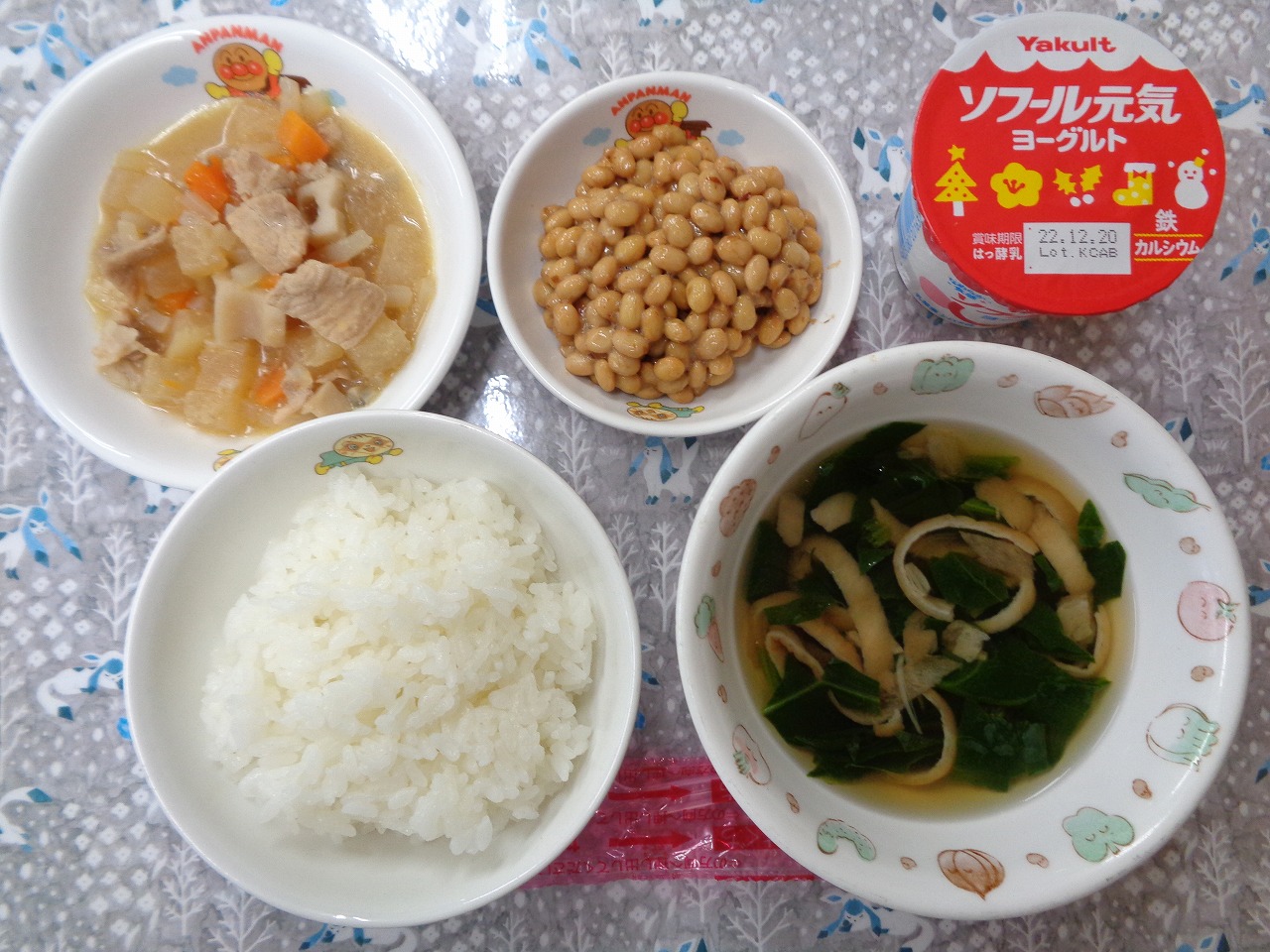 7日の給食は『豚肉と根菜のみそ煮・おかか納豆・すまし汁・ヨーグルト』で、おやつは『芋けんぴ・牛乳』でした🍠