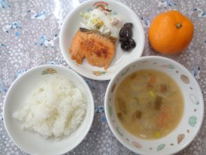 9日の給食は『鮭の西京焼き・大根サラダ・納豆汁・みかん』でした。今日は大黒様のお歳夜ですね。お家でも豆料理を食べて、“まめ”に暮らせるように願いましょう!
