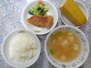 13日の給食は『赤魚の甘辛揚げ・お浸し・根菜汁・バナナ』で、おやつは『チーズチヂミ・牛乳』でした