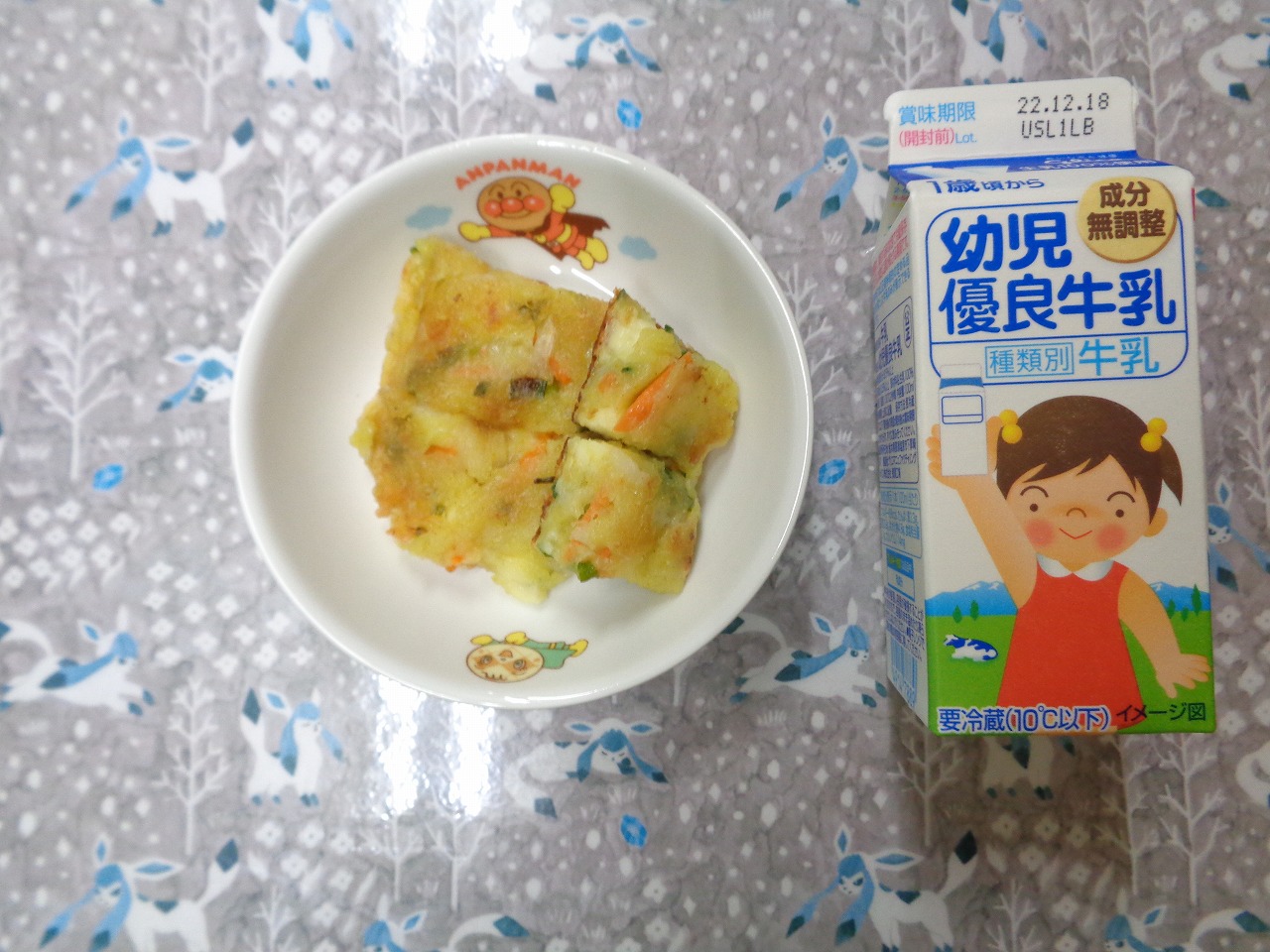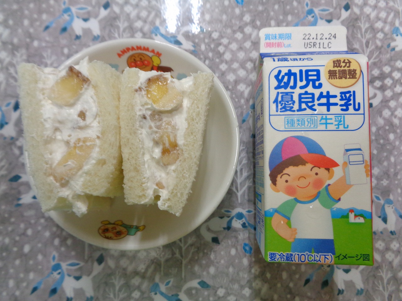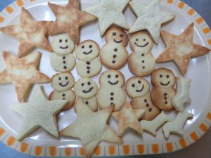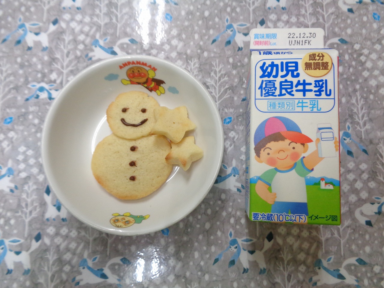 22日の給食は『豆腐入りナゲット・春雨サラダ・みそ汁・バナナ』で、おやつは『雪だるまクッキー・牛乳』でした⛄