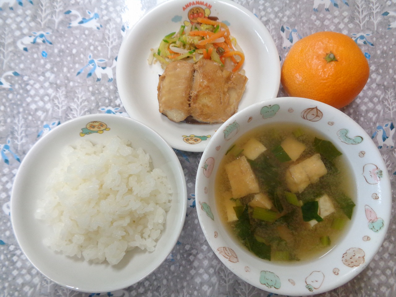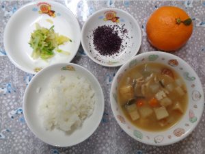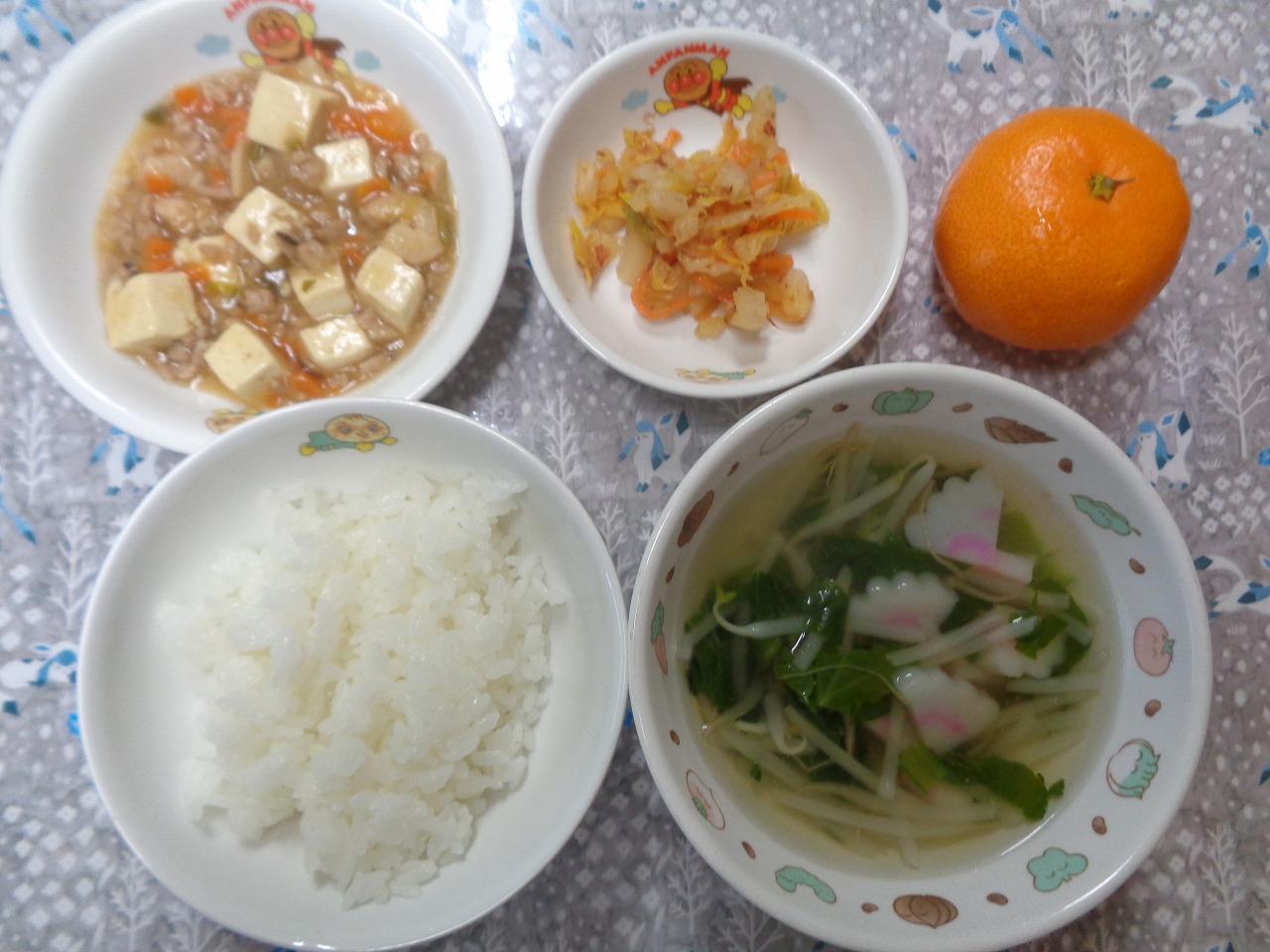 16日の給食は『麻婆豆腐・おかか和え・もやしスープ・みかん』でした🍊