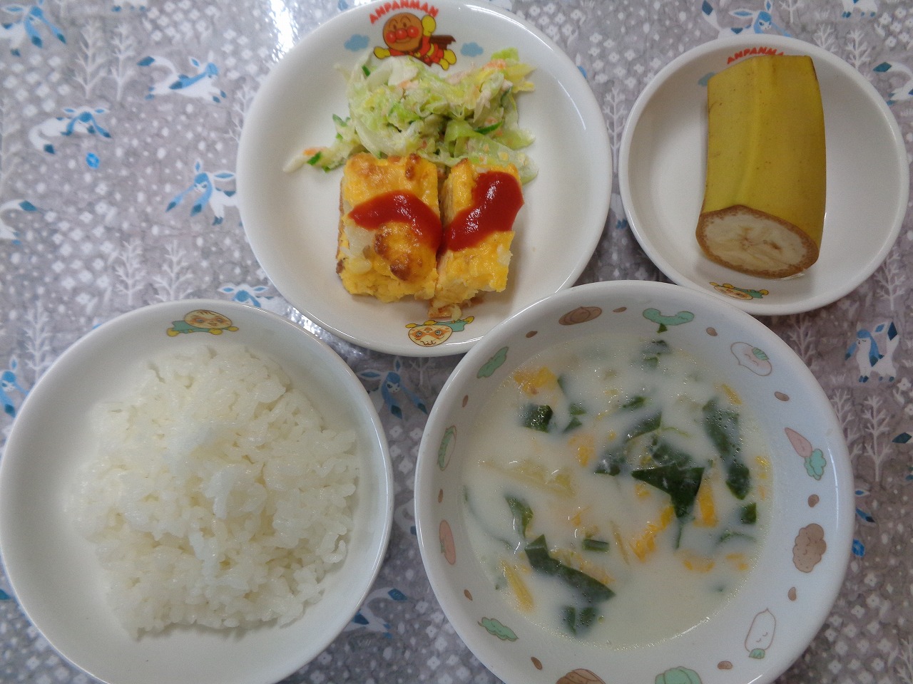 19日の給食は『スパニッシュオムレツ・ツナサラダ・白菜スープ・バナナ』でした。ちなみにスパニッシュは、スペイン風という意味です