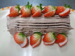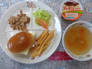 20日の給食は『焼肉バーガー・フライドポテト・コンソメスープ・プリン』で、おやつは『ケーキ・麦茶』でした。今回のケーキはブッシュドノエルです