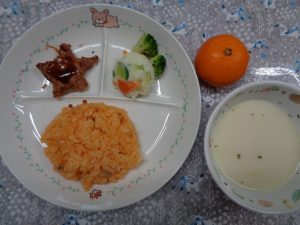 23日の給食は『チキンライス・ハンバーグ・ポテトサラダ・コーンスープ・みかん』でした。日本海側が大荒れの予報