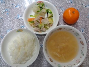 27日の給食は『豚肉の塩麹炒め・浅漬け・みそ汁・みかん』で、おやつは『五平餅・麦茶』でした🍊