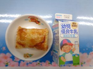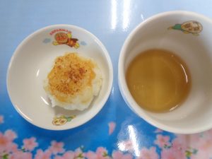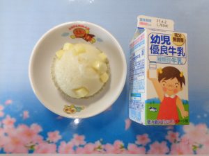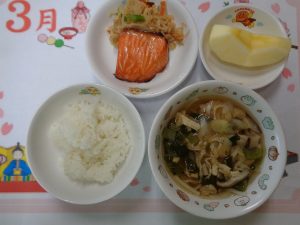 1日の給食は『鮭の生姜焼き・切干大根煮・うどん汁(未満児:そうめん汁)・りんご』で、おやつは、『二色団子・牛乳』でした🍎