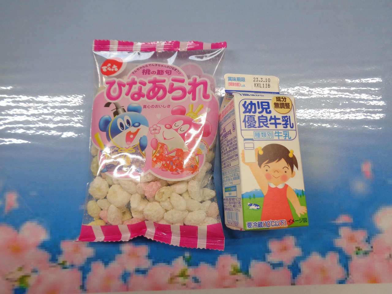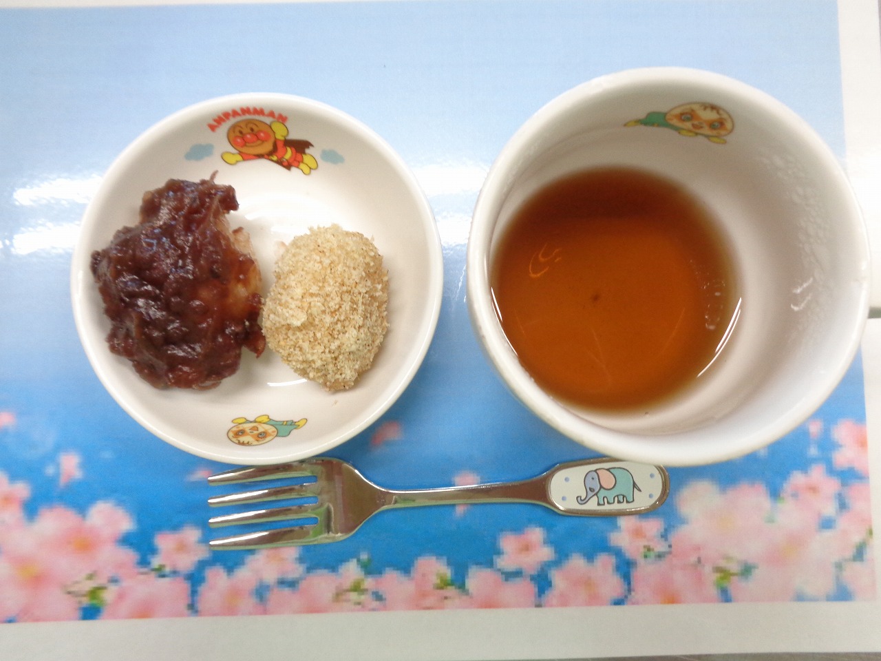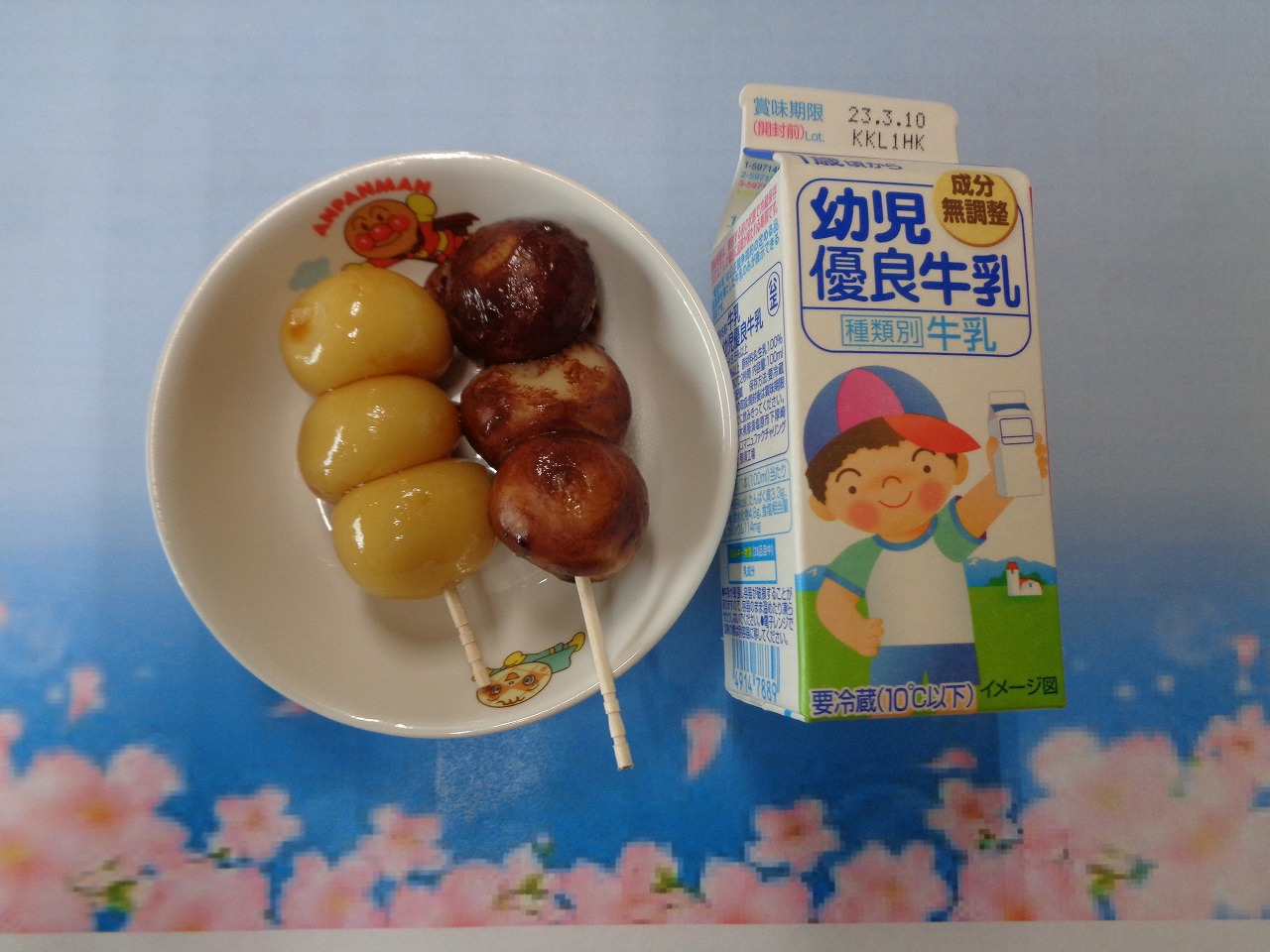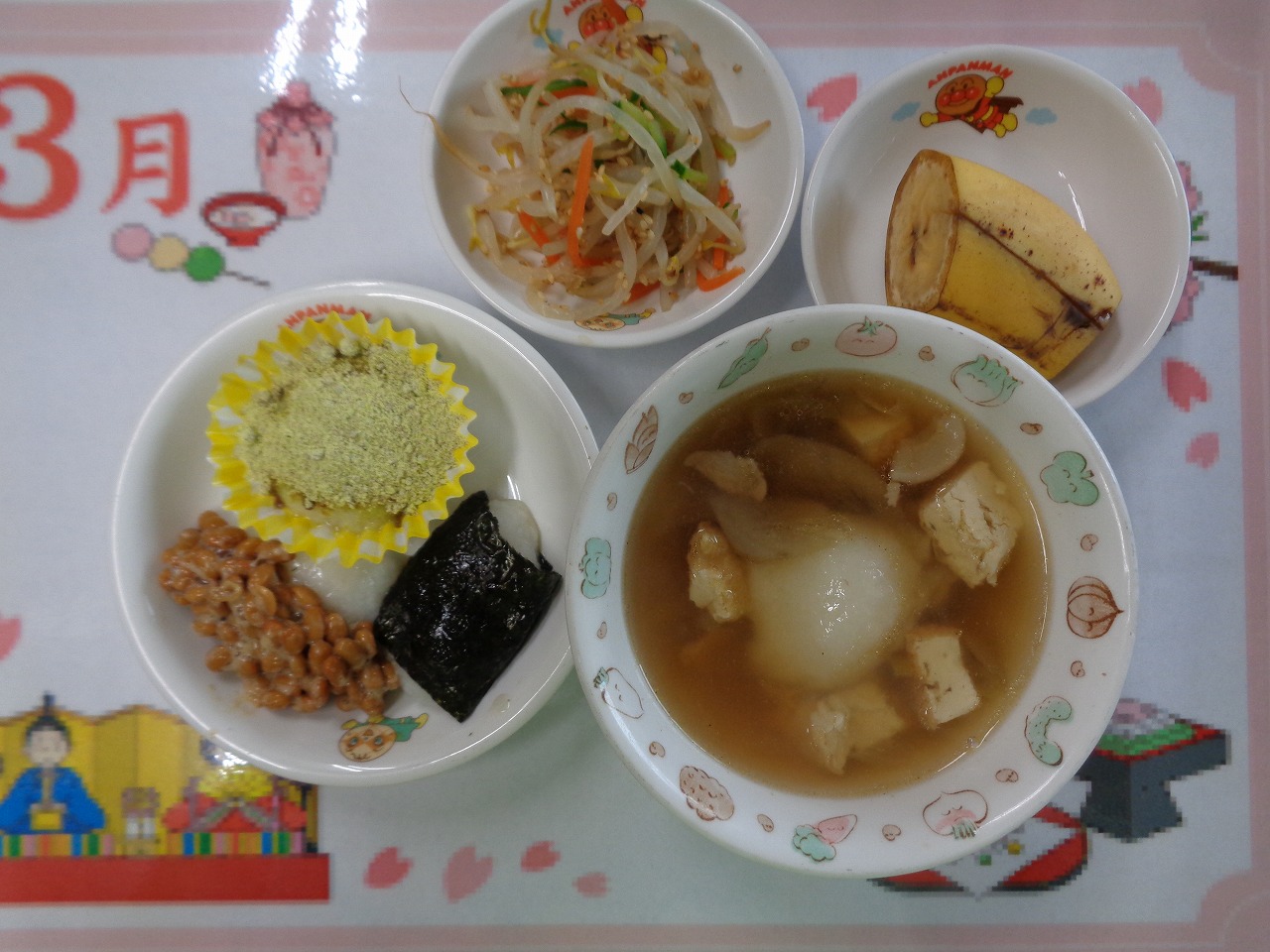 3日の給食は『もち(磯部・きな粉・納豆)・汁もち・ごま和え・バナナ』で、おやつは『ひなあられ・牛乳』でした🎎未満児は、うどんを食べました