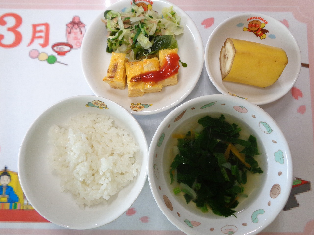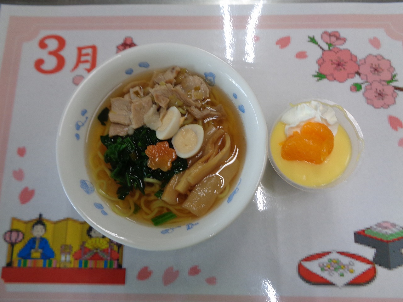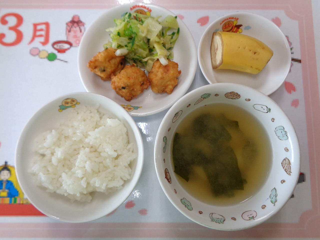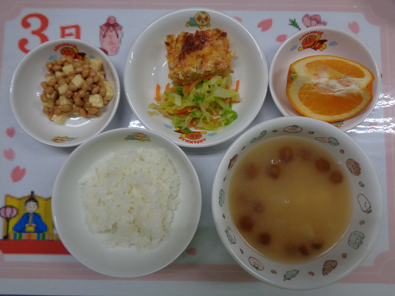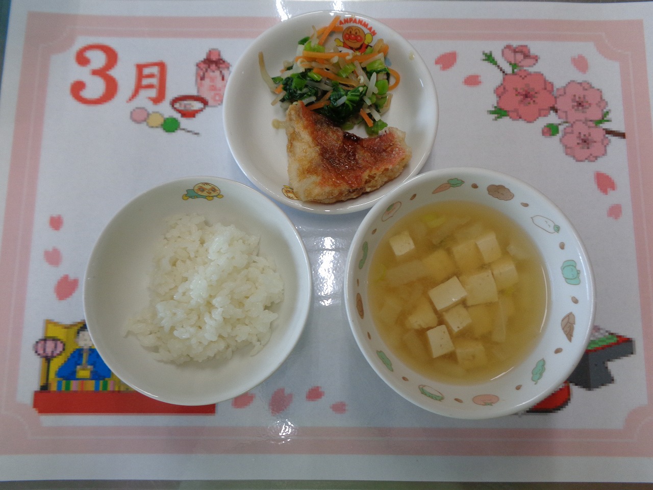 3日の給食は『もち(磯部・きな粉・納豆)・汁もち・ごま和え・バナナ』で、おやつは『ひなあられ・牛乳』でした🎎未満児は、うどんを食べました
