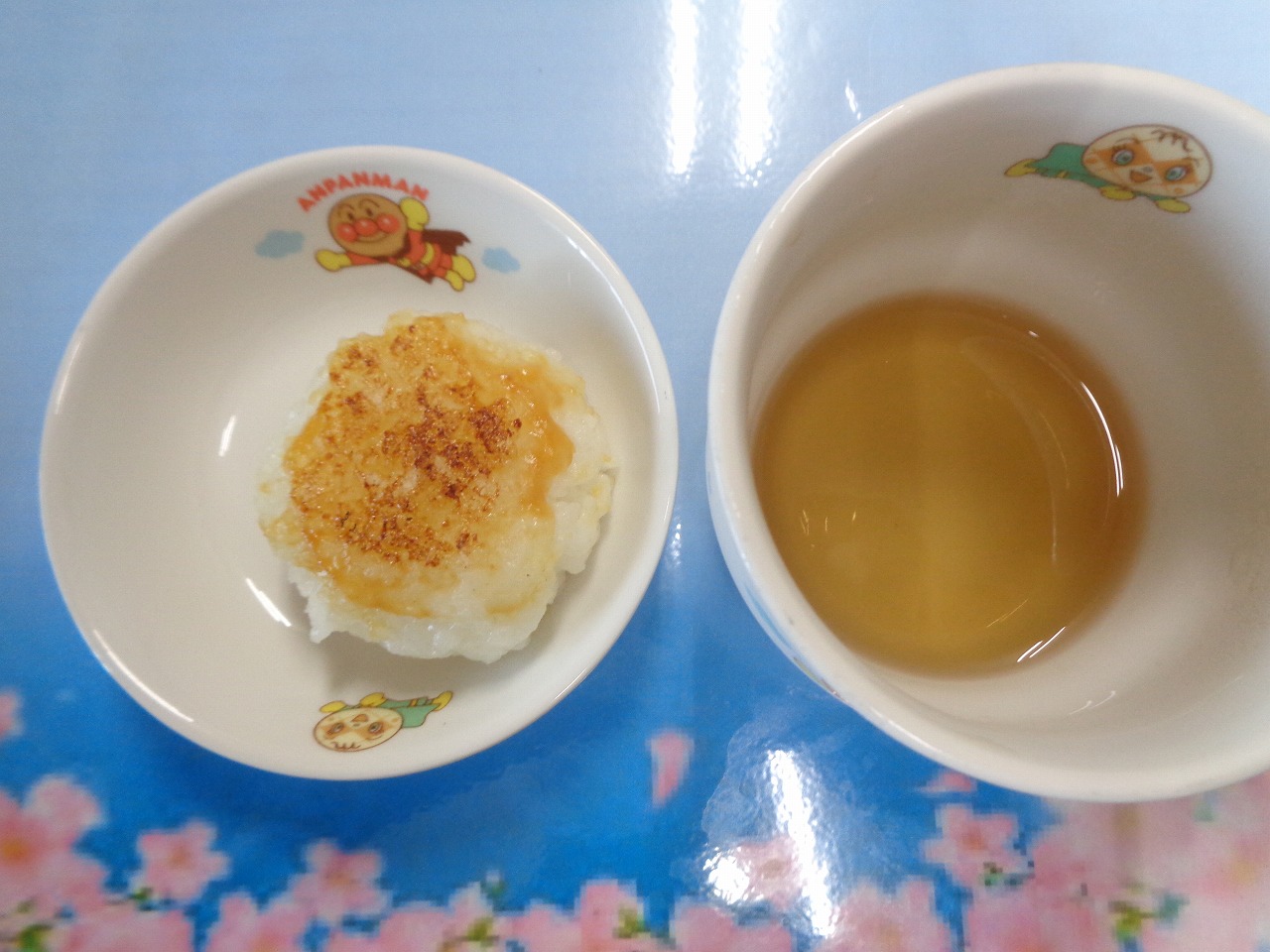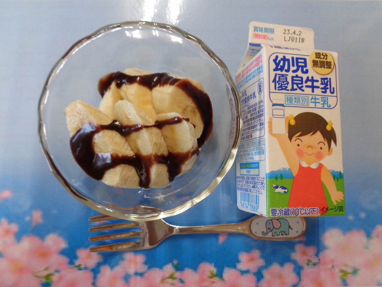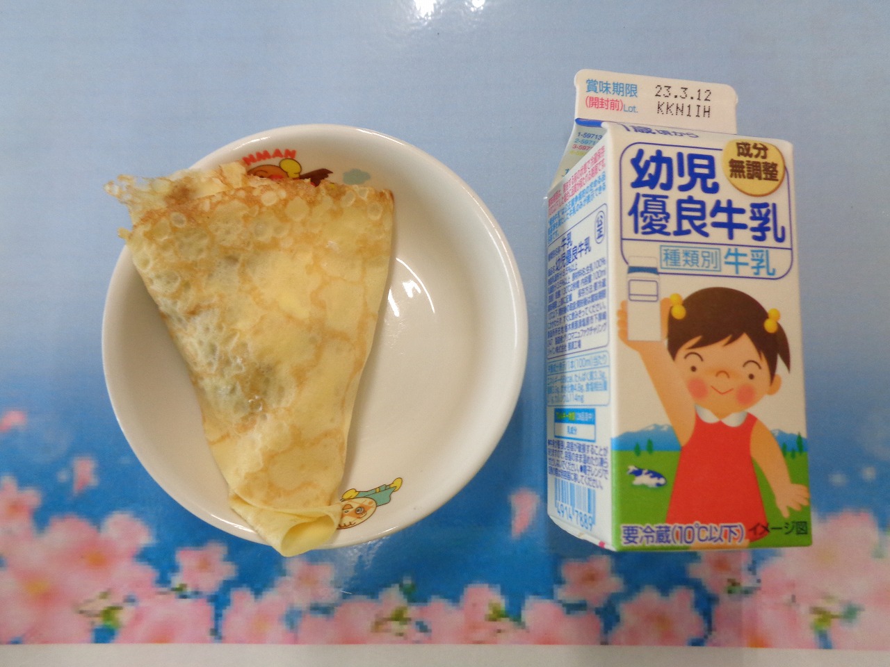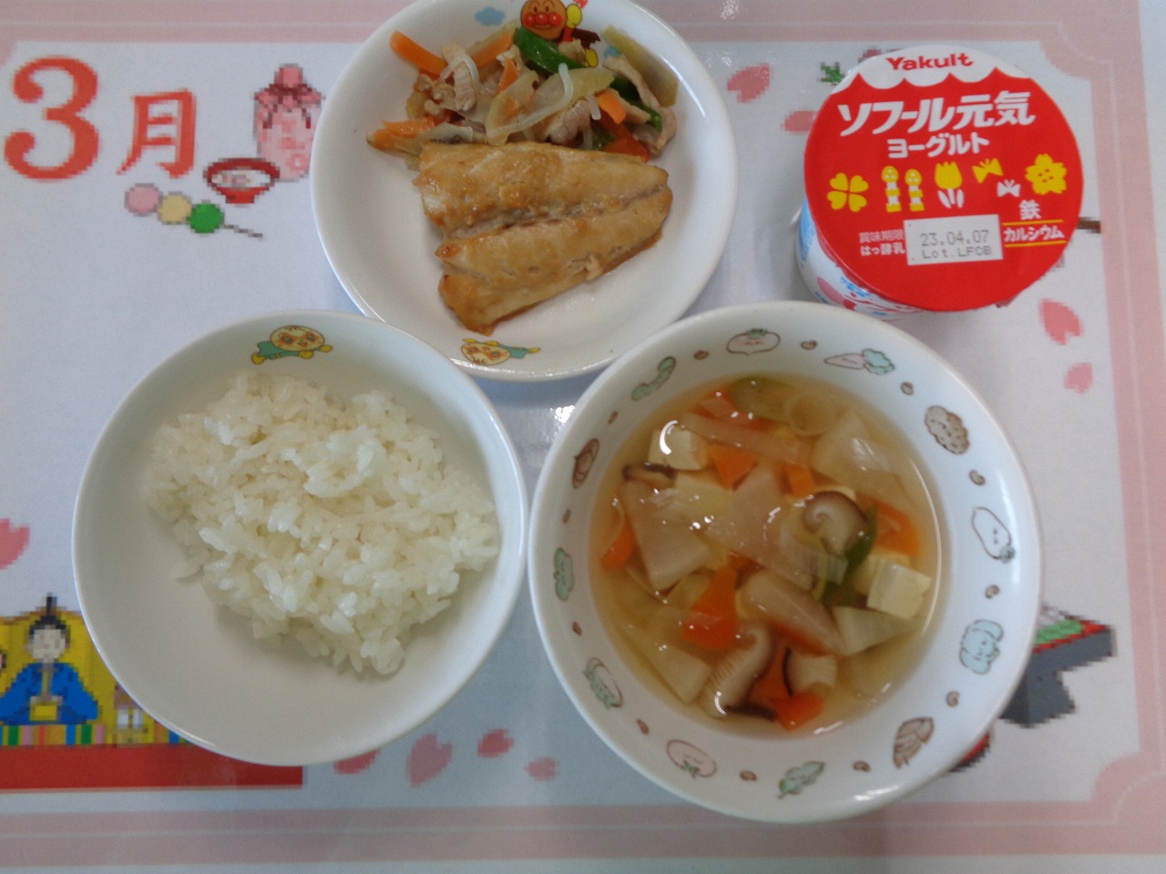 3日の給食は『もち(磯部・きな粉・納豆)・汁もち・ごま和え・バナナ』で、おやつは『ひなあられ・牛乳』でした🎎未満児は、うどんを食べました