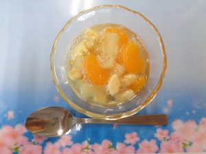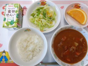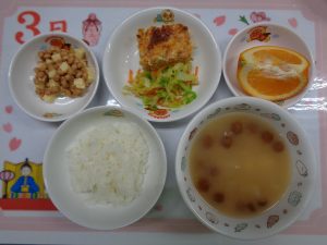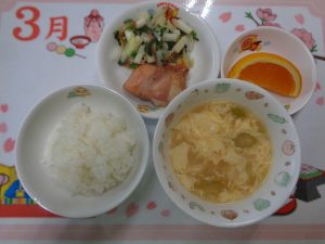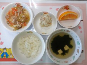 15日の給食は『ごはん・八宝菜・ポークシュウマイ・中華スープ・オレンジ』で、おやつは『フルーツポンチ』でした🍊