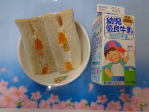 2日の給食は『鶏のマーマレード焼き・うるいの和え物・かきたま汁・オレンジ』で、おやつは『フルーツサンド・牛乳』でした🍊