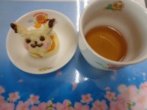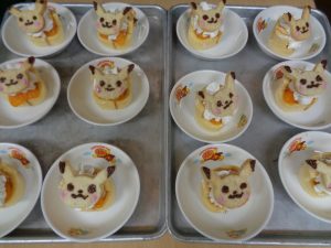 7日の誕生会の給食は『五目ラーメン・プリンアラモード』で、おやつは『ピカチュウケーキ・麦茶』でした