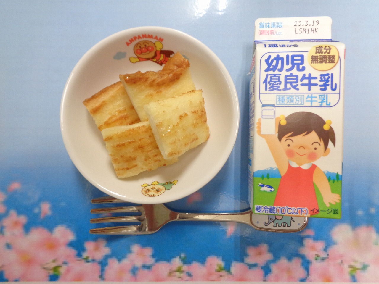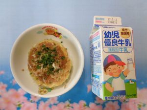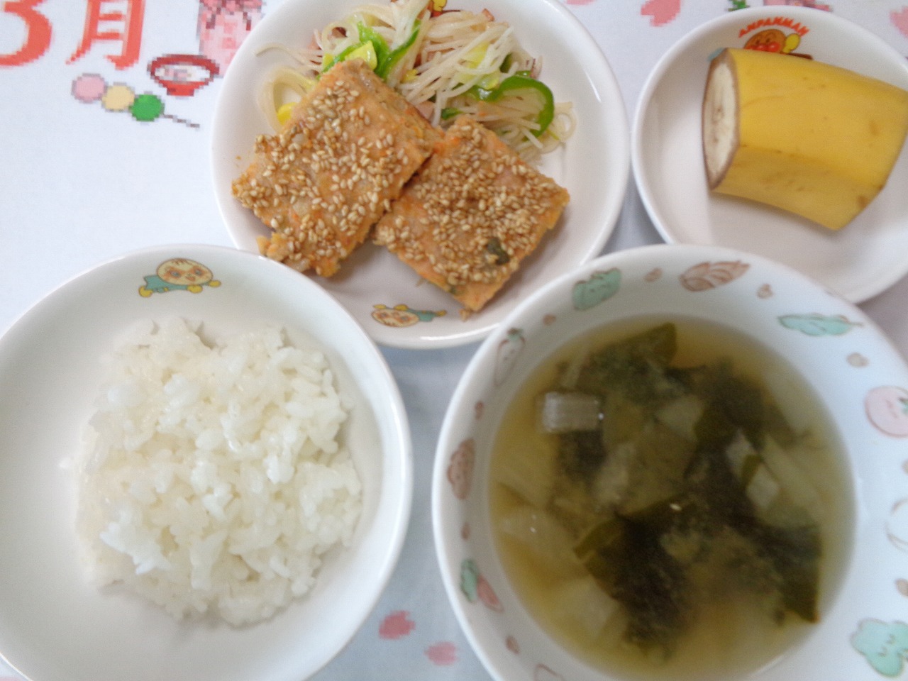 8日の給食は『豆腐のふんわり揚げ・きもど入りごまみそ和え・みそ汁(じゃが芋・わかめ)・バナナ』で、おやつは『お好み焼き・牛乳』でした🍌