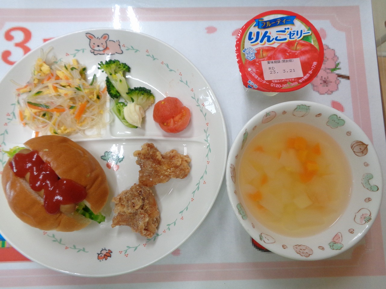 9日のお別れ会の給食は、ばら組さん全員で考えたメニューの『ホットドッグ・茹で野菜・鶏の唐揚げ・春雨サラダ・コンソメスープ・ゼリー』で、おやつは『バナナクレープ・牛乳』でした✨