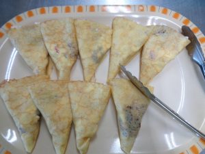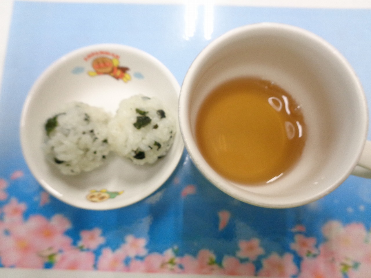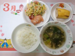 10日の給食は『五目卵焼き・二色和え・なめこ汁・いよかん』で、おやつは『わかめおにぎり・麦茶』でした
