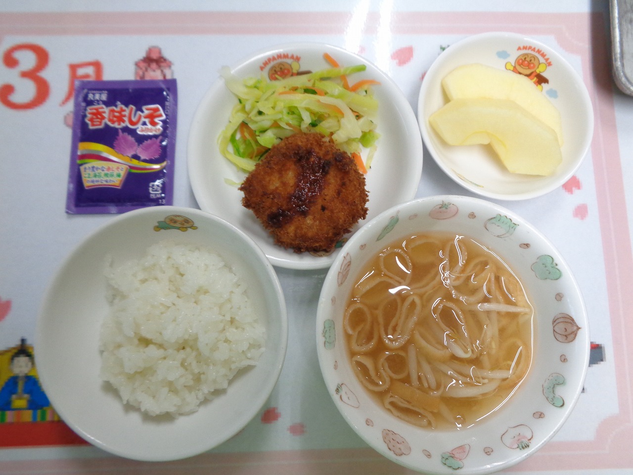 13日の給食は『コロッケ・ミックスキャベツ・ふりかけ・みそ汁(もやし・焼き麩)・りんご』でした🍎