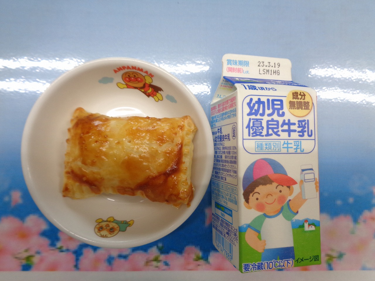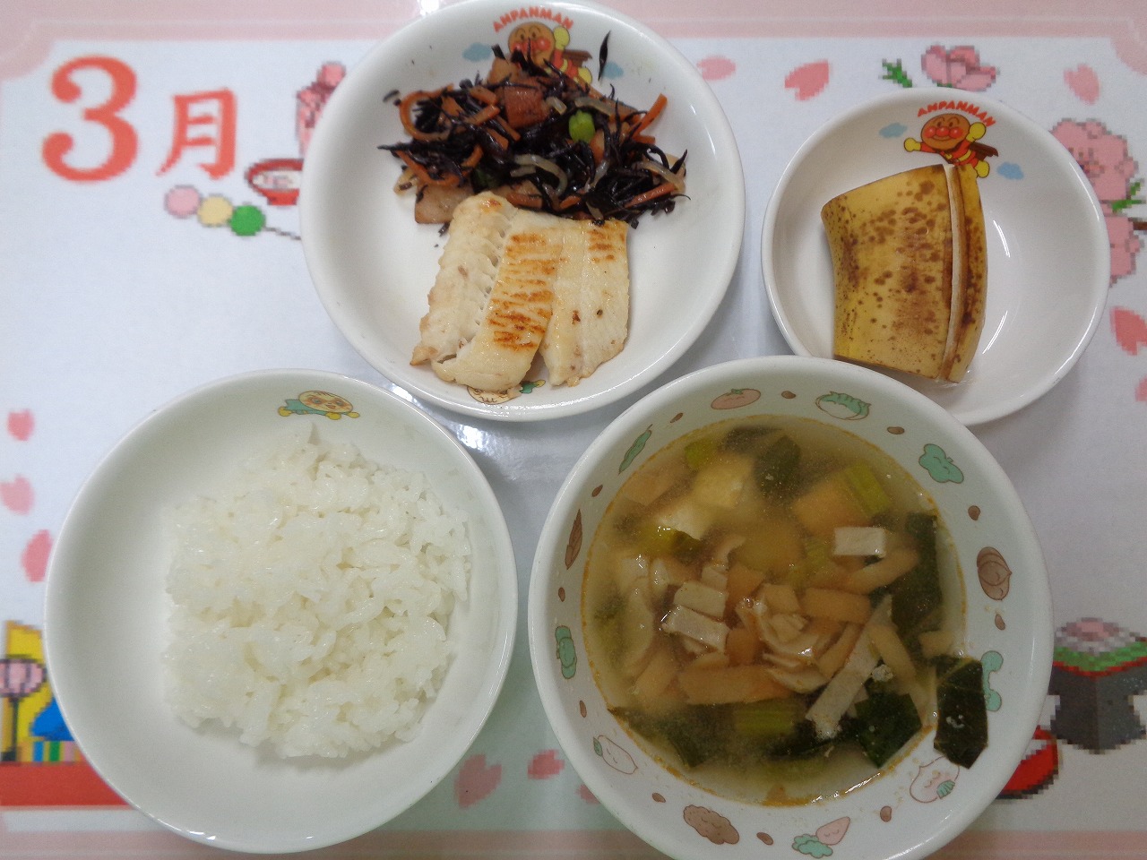 14日の給食は『カレイの梅焼き・ひじき炒め煮・みそ汁(小松菜・厚揚げ・焼き麩)・バナナ』で、おやつは『アップルパイ・牛乳』でした🍌