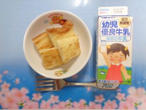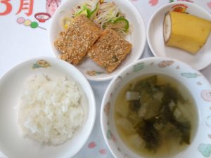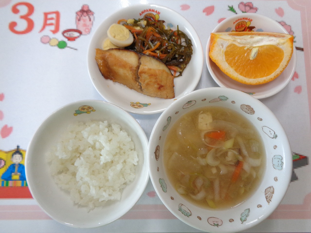 16日、庄内浜お魚デーの給食は『鰆のみそ焼き・すき昆布煮・具だくさんみそ汁(大根・人参・ごぼう・椎茸・豆腐・葱)・いよかん』で、おやつは『フレンチトースト・牛乳でした