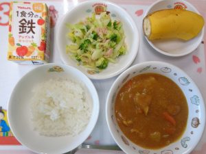 20日の給食は『ポークカレー・ブロッコリーサラダ・キャロットジュース・バナナ』でした🍌