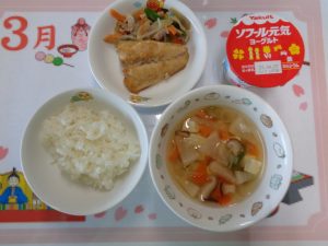 22日の給食は『さばのみそ焼き・五目きんぴら・けんちん汁・ヨーグルト』で、おやつは『おはぎ・麦茶』でした