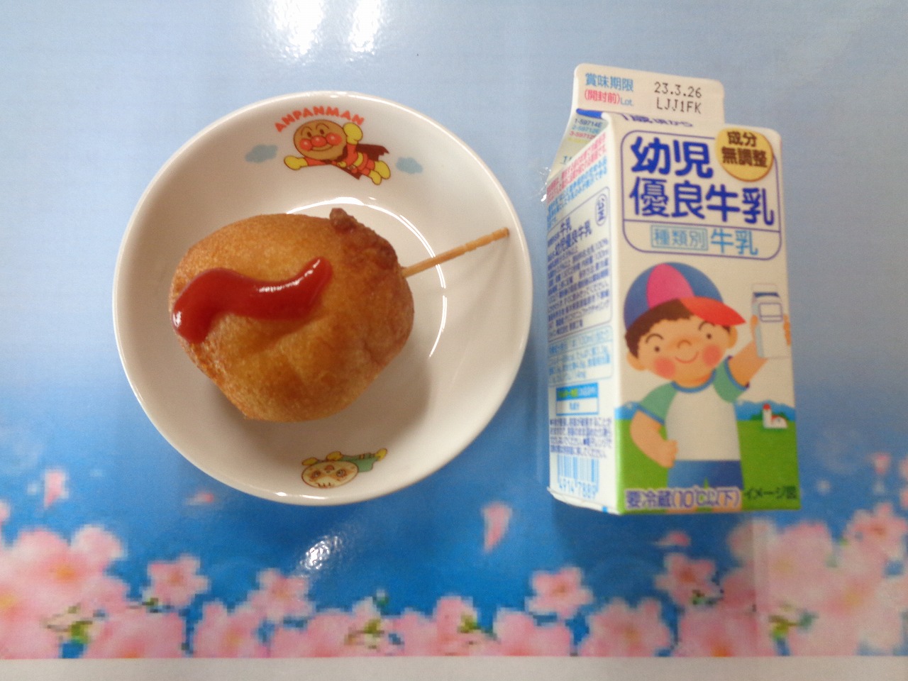 23日の給食は『スパニッシュオムレツ・わかめサラダ・ふりかけ・コンソメスープ・バナナ』で、おやつは『アメリカンドッグ・牛乳』でした🍌