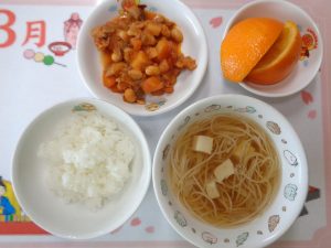 27日の給食は『ポークビーンズ・しょうゆフレンチ・そうめん汁・いよかん』でした