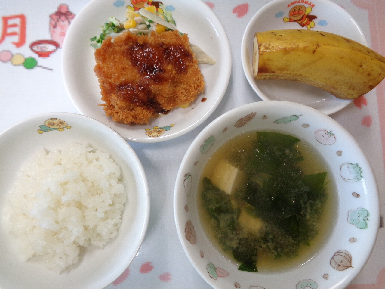 28日の給食は『チキンカツ・ごぼうサラダ・みそ汁(わかめ・豆腐)・バナナ』で、おやつは『五平餅・麦茶』でした🍌