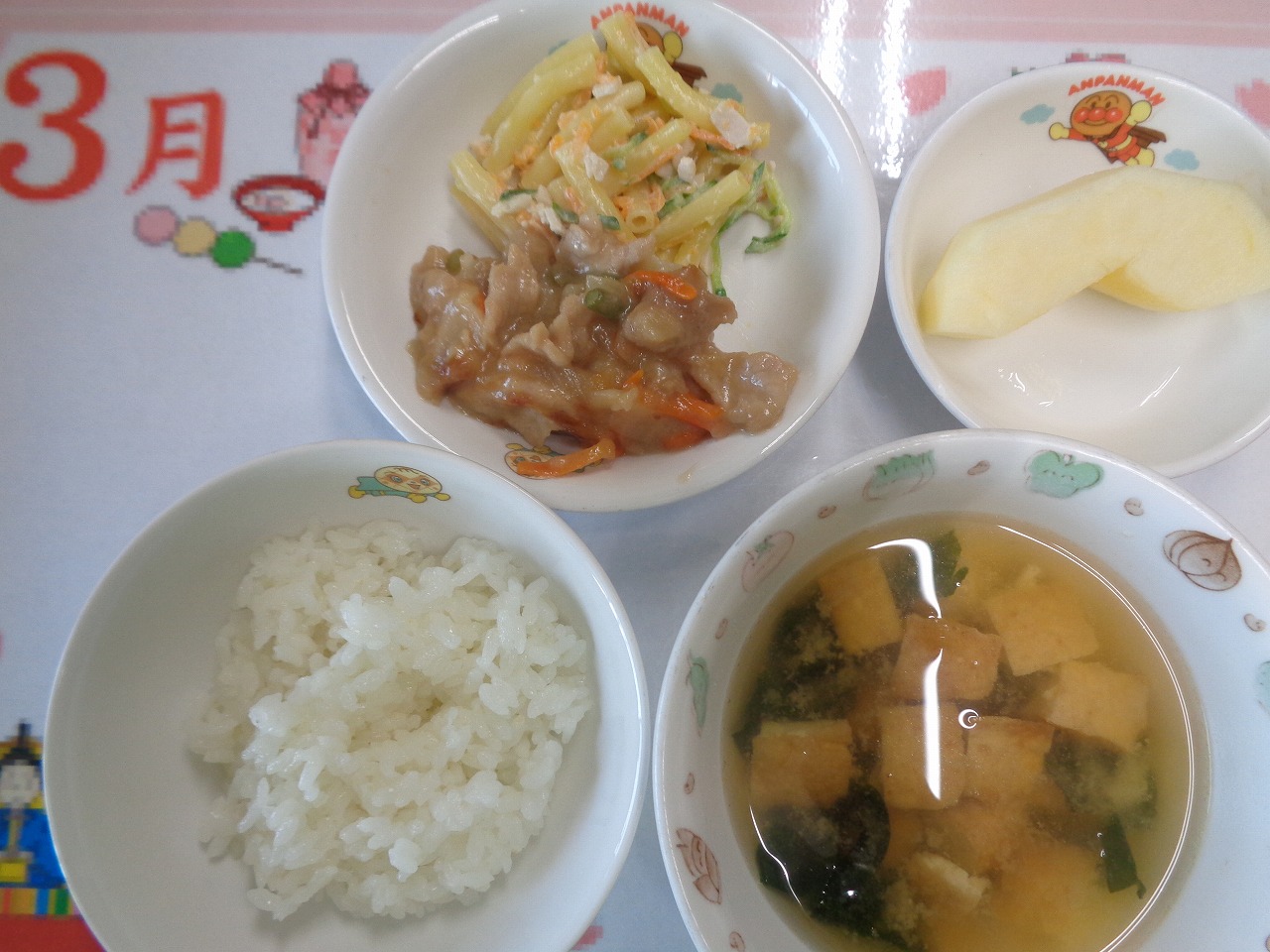 29日の給食は『豚肉の甘酢ソテー・マカロニサラダ・みそ汁(厚揚げ・わかめ)・りんご』で、おやつは『チーズ蒸しパン・牛乳』でした🍎