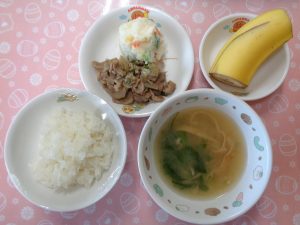 3日の給食は『豚肉の生姜焼き・ポテトサラダ・みそ汁・バナナ』でした。今年度も安心・安全な給食を提供していきますので、よろしくお願いします!写真は基本的に以上児さんのおかず・おやつを載せていきます