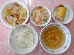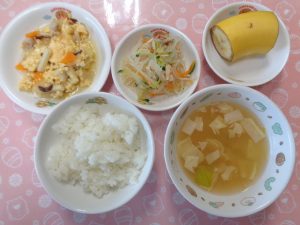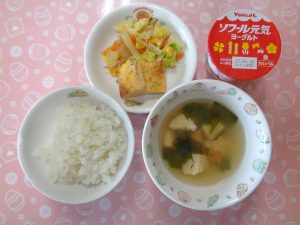 4日の給食は『五目卵焼き・野菜炒め・みそ汁・ヨーグルト』でした🍳