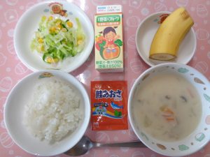 5日の給食は『クリームシチュー・コールスロー・ふりかけ・野菜ジュース・バナナ』でした。