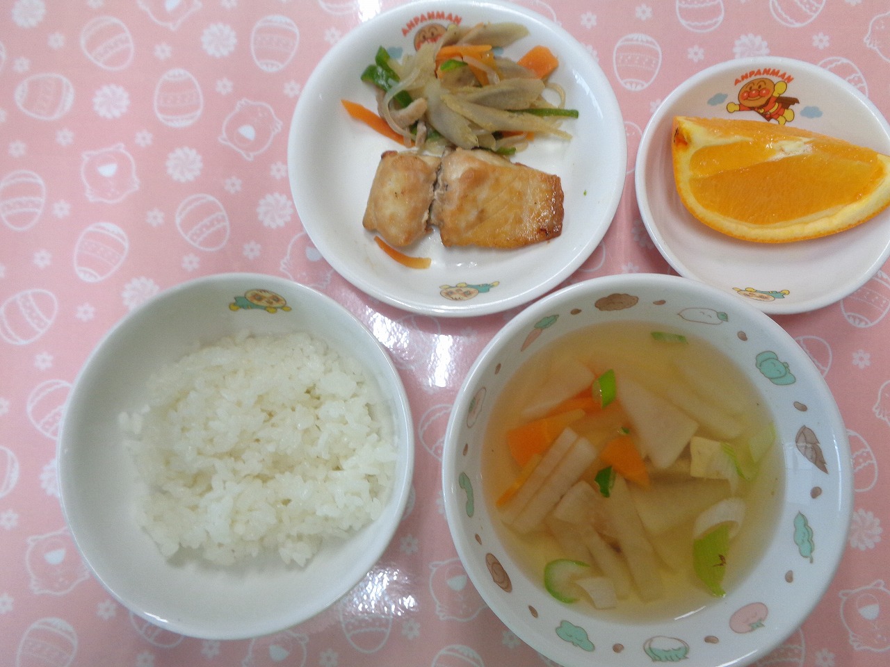 6日の給食は『さばのみそ焼き・五目きんぴら・具だくさん汁・オレンジ』で、おやつは『青のりポテト・牛乳』でした