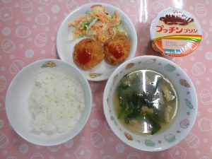 7日の給食は『豆腐入りチキンナゲット・アスパラサラダ・みそ汁・プリン』でした🍮