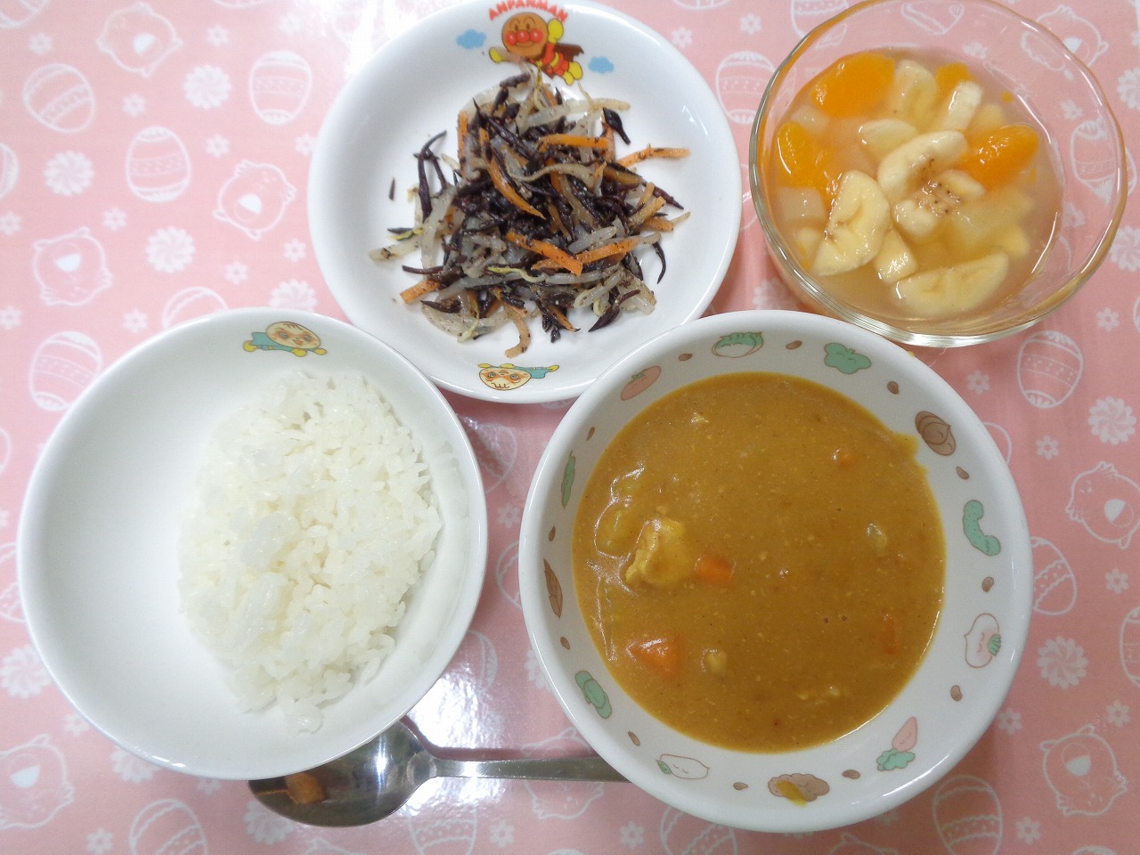 10日の給食は『ポークカレー・ひじきサラダ・白ぶどうジュース・フルーツポンチ』でした🍛