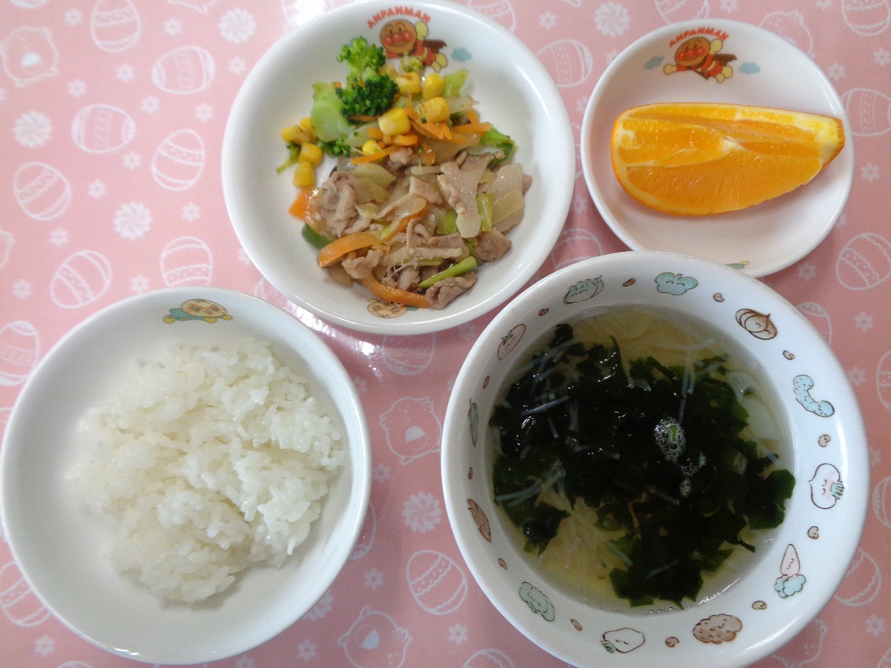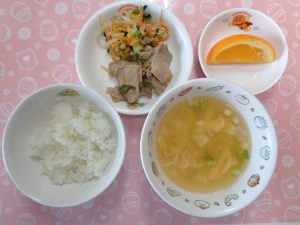 27日の給食は『豚肉の中華ソテー・もやしのナムル・かき玉汁・オレンジ』で、おやつは『いちごパイ・牛乳』でした🍓