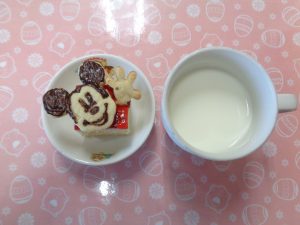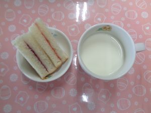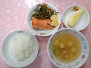 12日の給食は『鮭の照り焼き・すき昆布煮・みそ汁・りんご』で、おやつは『ジャムサンド・牛乳』でした