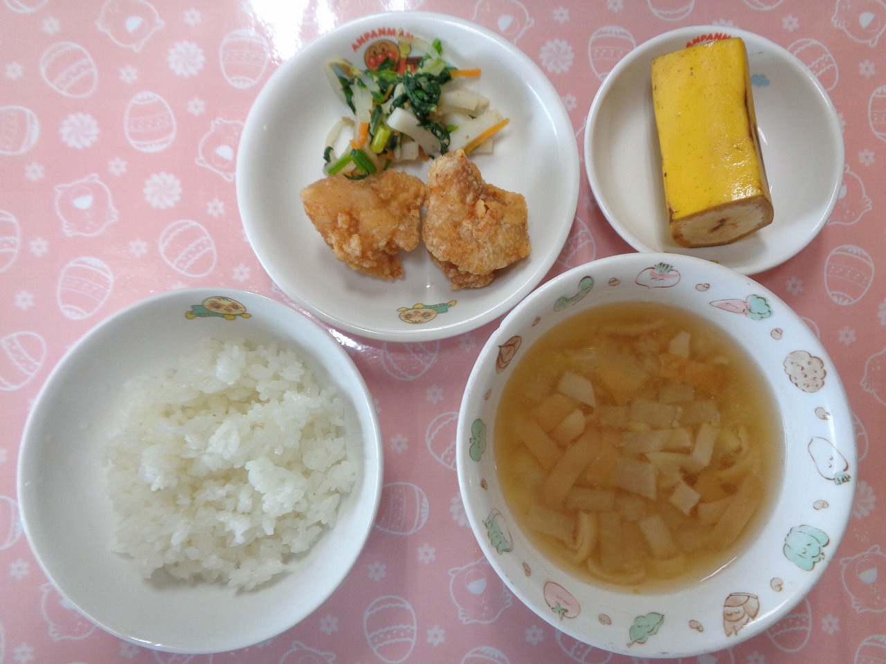 13日の給食は『ご飯・鶏肉のから揚げ・うるいのごま和え・みそ汁・バナナ』で、おやつは『いちごプリン』でした🍓