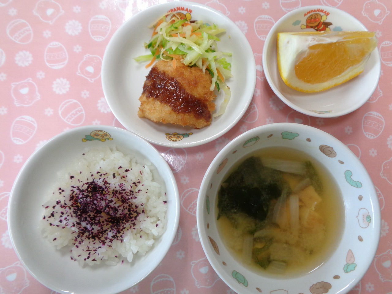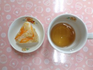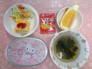 18日の給食は『カレイフライ・キャベツのごまサラダ・ゆかり・みそ汁・ジューシーフルーツ』で、おやつは『たけのこおにぎり・麦茶』でした