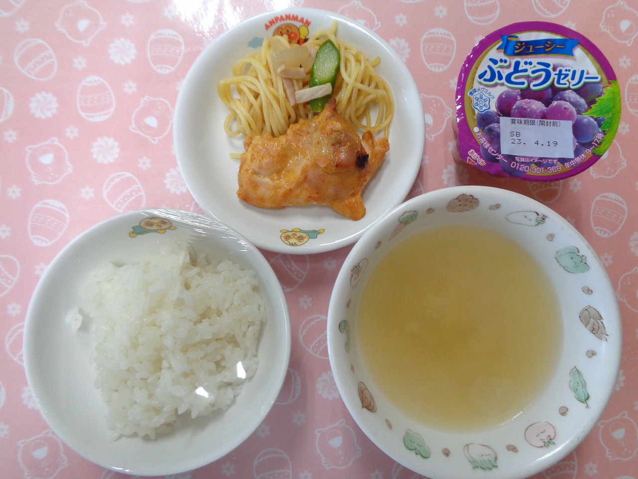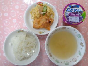 17日の給食は『タンドリーチキン・パスタソテー・コーンスープ・ぶどうゼリー』でした