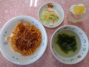 19日の給食は『ミートソーススパゲッティ・コーンサラダ・わかめスープ・ゼリーアラモード』で、おやつは『ケーキ・麦茶』でした。「僕ミートソース苦手だけど、ちょっとずついっぱい食べられるようにするからね!」と、苦手なものと向き合おうとする、ステキな年長さんがいました✨🍝