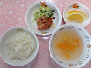21日の給食は『照り焼きチキン・フレンチサラダ・コンソメスープ・ジューシーフルーツ』でした