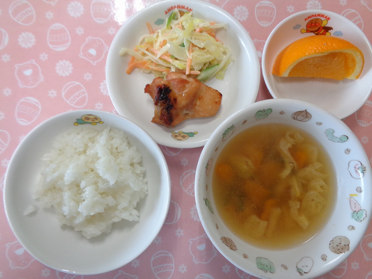 24日の給食は『鶏肉のマーマレード焼き・アスパラサラダ・みそ汁・オレンジ』でした
