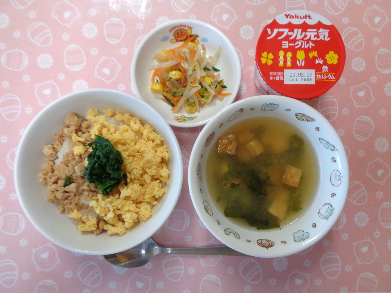 25日の給食は『三食丼・おかか和え・みそ汁・ヨーグルト』で、おやつは『むきそば風』でした