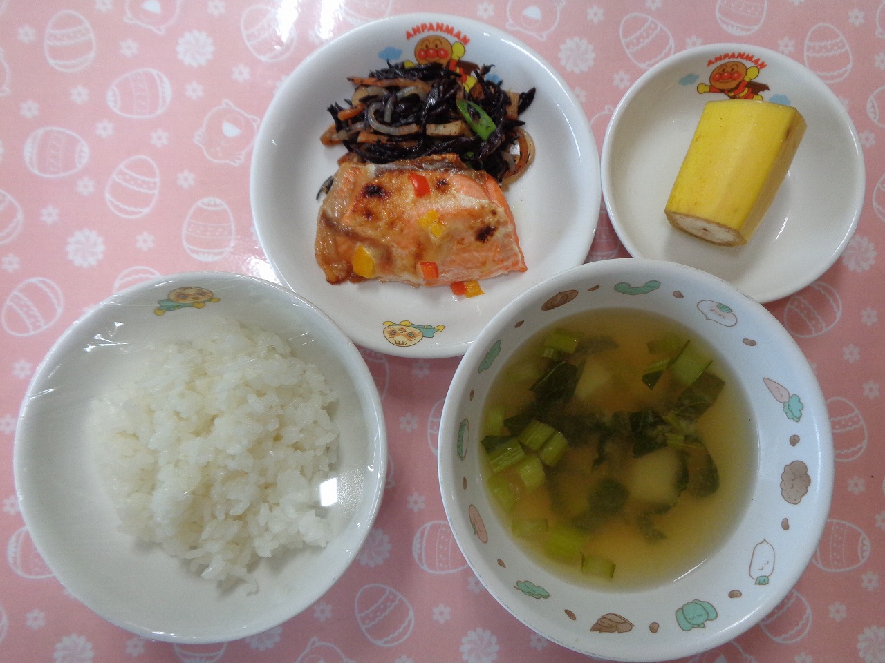 26日の給食は『鮭のマヨネーズ焼き・ひじきの炒め煮・みそ汁・バナナ』で、おやつは『お好み焼き・牛乳』でした。マヨネーズ焼きには刻んだパプリカがのって、彩りよく美味しかったです